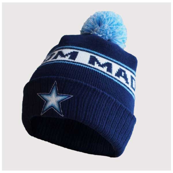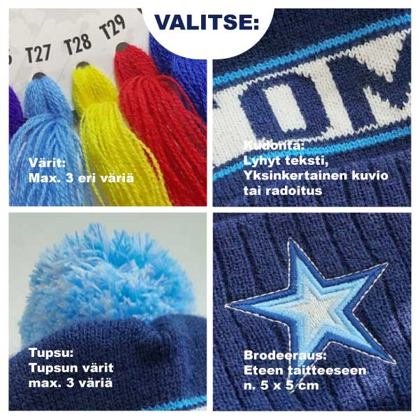 Paksu laadukas neulepipo käänteellä, tupsulla ja brodeerauksella. Pipoon ja tupsuun valittavissa max. kolme väriä värikartan lankaväreistä. Pipon yläosan neulokseen voidaan toteuttaa lyhyt teksti, yksinkertainen kuvio tai raidoitus. Taitteeseen eteen mahtuu lisäksi n. 5 x 5 cm kokoinen brodeeraus.